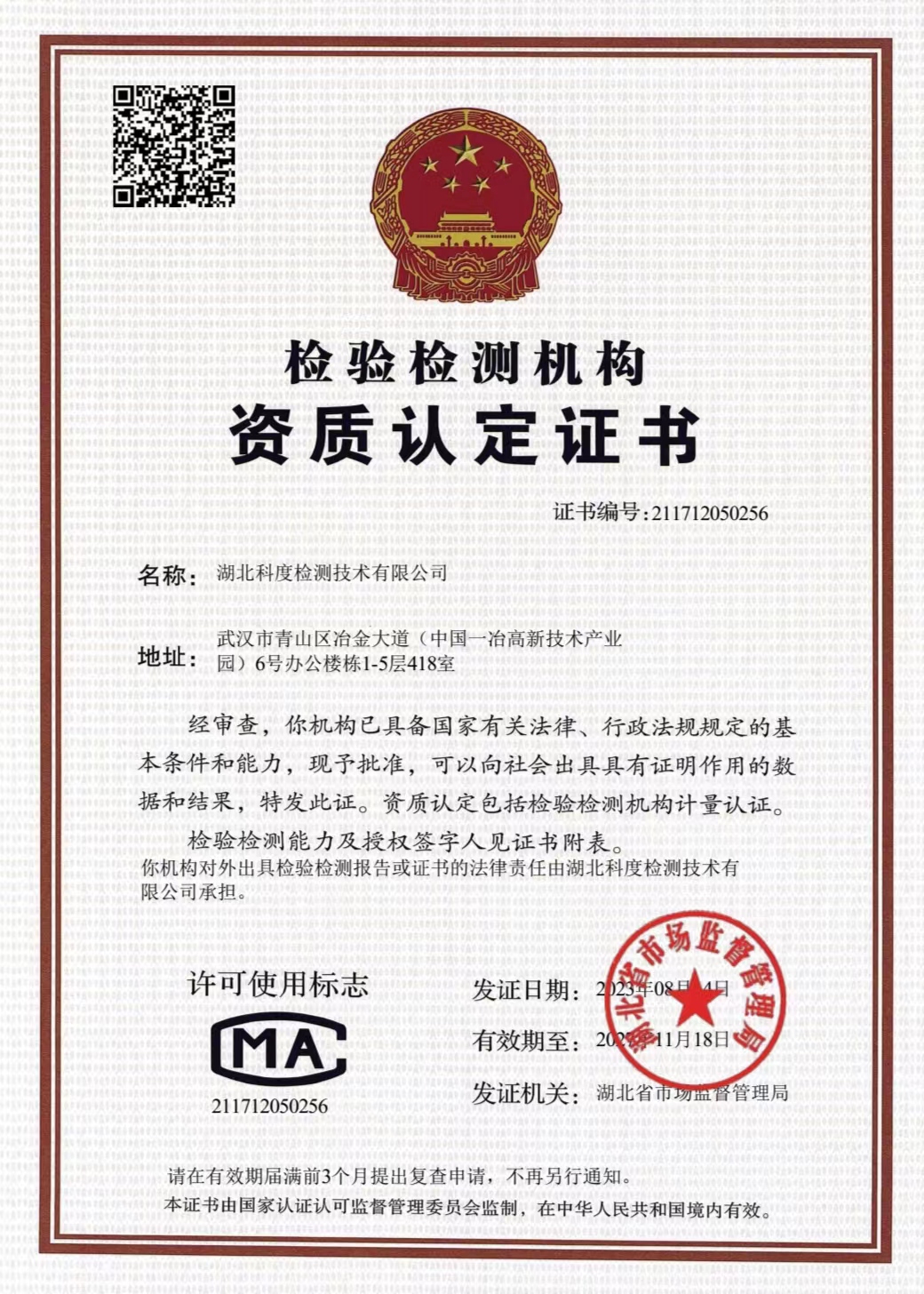 湖北科度檢測技術(shù)有限公司是一家專業(yè)從事環(huán)境類及相關(guān)領(lǐng)域檢測的第三方檢測機(jī)構(gòu),公司已通過湖北省市場監(jiān)督管理局CMA計量認(rèn)證,可以面向社會出具權(quán)威CMA檢測報告。 我公司實(shí)驗(yàn)室嚴(yán)格按照國家標(biāo)準(zhǔn)建設(shè),擁有一大批國內(nèi)外先進(jìn)儀器設(shè)備及現(xiàn)代化配套設(shè)施,并有經(jīng)驗(yàn)豐富的中高級專業(yè)技術(shù)人員和嚴(yán)格的實(shí)驗(yàn)室質(zhì)量保證體系為項(xiàng)目運(yùn)作提供強(qiáng)力支撐。 作為第三方檢測機(jī)構(gòu),公司始終以高度的社會責(zé)任感經(jīng)營企業(yè),以“公正、嚴(yán)謹(jǐn)、高效”為宗旨,依托專業(yè)的技術(shù)實(shí)力為客戶提供專業(yè)優(yōu)質(zhì)檢測服務(wù),受到政府、企業(yè)和社會各界的廣泛關(guān)注和認(rèn)可。